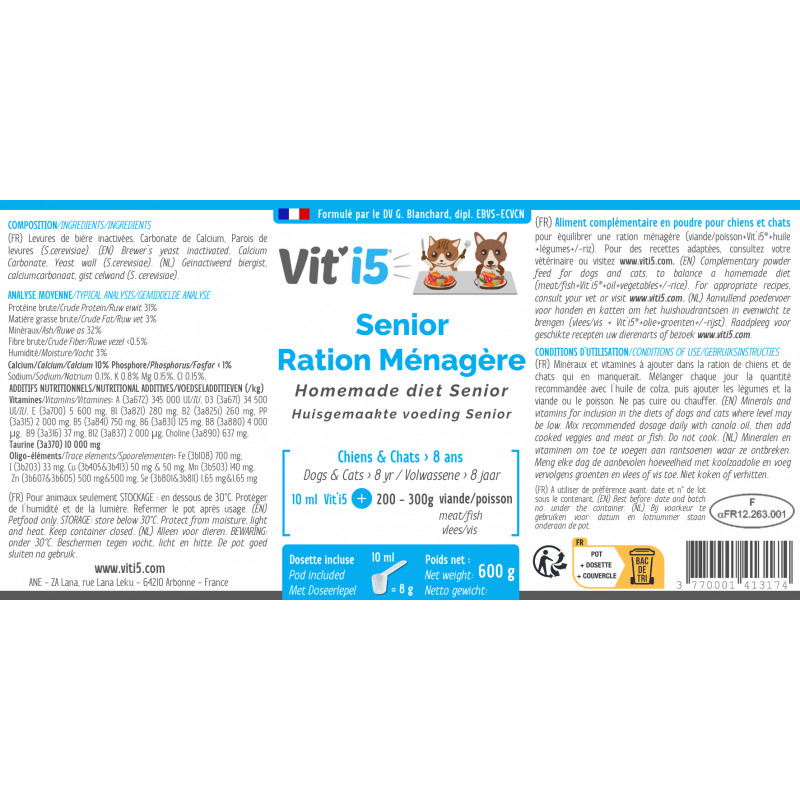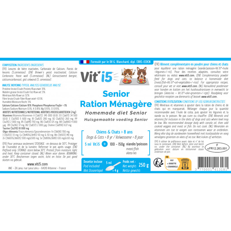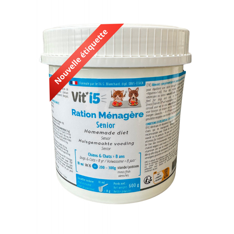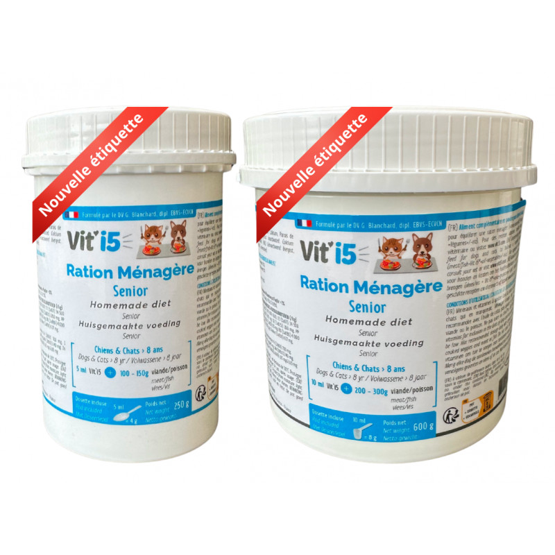 Vit'i5 Senior Ration Ménagère (Bleu) est formulé spécifiquement par notre vétérinaire nutritionniste pour équilibrer en minéraux, vitamines et oligo-éléments l'alimentation ménagère des chiens et chats = viande/poisson + Vit'i5 Senior Ration Ménagère (Bleu) + huile de colza + légumes +/- féculent.