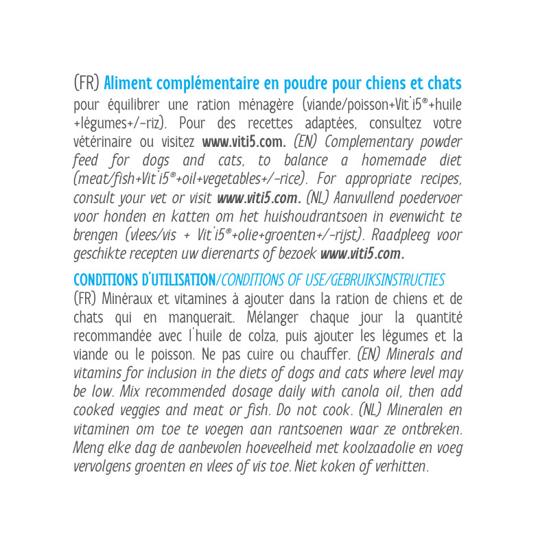 Vit'i5 Senior Ration Ménagère (Bleu) est formulé spécifiquement par notre vétérinaire nutritionniste pour équilibrer en minéraux, vitamines et oligo-éléments l'alimentation ménagère des chiens et chats = viande/poisson + Vit'i5 Senior Ration Ménagère (Bleu)+ huile de colza + légumes +/- féculent.