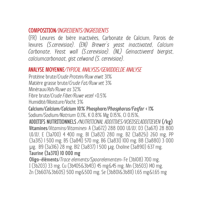 Vit'i5 Ration Mixte (Rouge) contient du Calcium et tous les oligo-éléments (Cuivre, Zinc, Sélénium, Iode, Manganèse, Fer) et vitamines (A, D, E, B1, B2, B5, B6, B12, PP, Folates, Choline...) dont le chat et le chien ont besoin pour leur équilibre et leur vitalité. Il contient aussi de la taurine pour les cas où la viande de la ration ménagère serait surcuite ou en conserve ainsi que des MOS (Manno-Oligo-Saccharides) et des béta-glucanes de levure, pour un meilleur confort et une meilleure résistance digestifs.