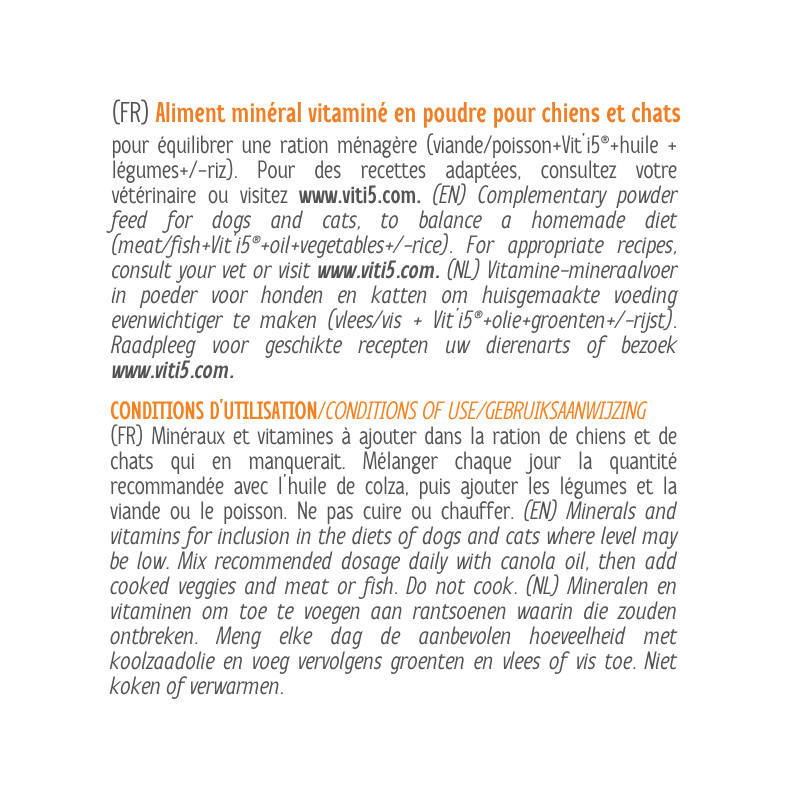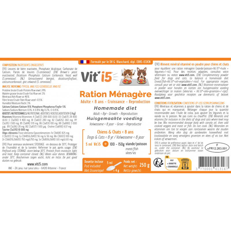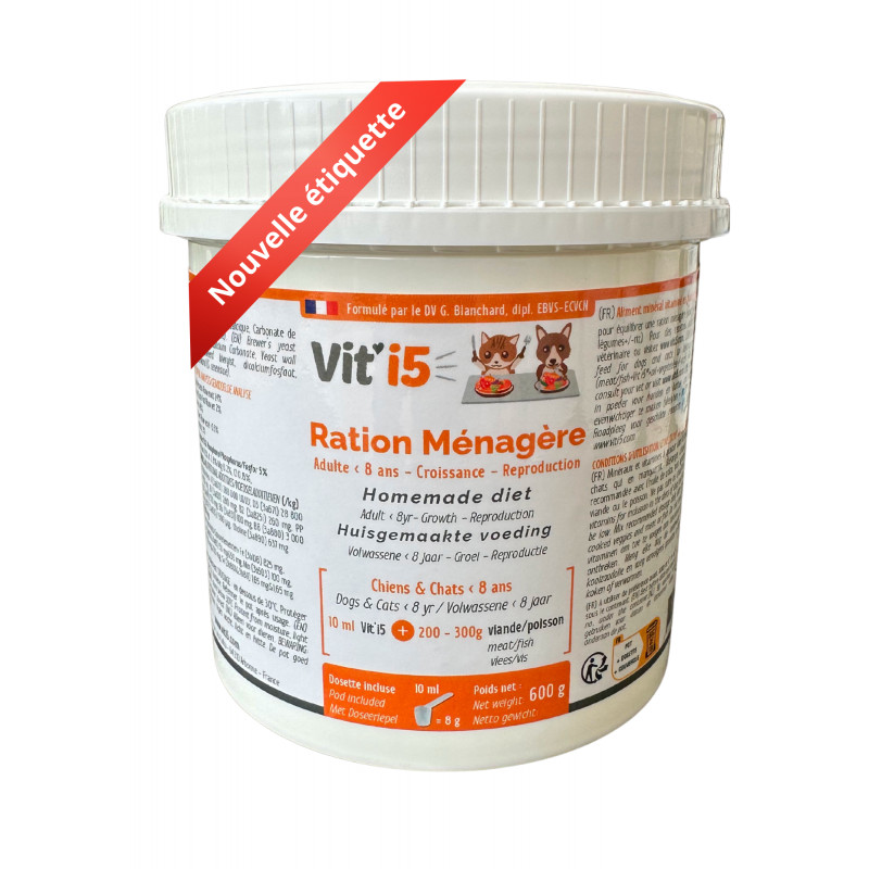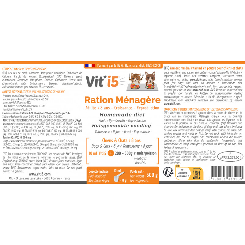 Vit'i5 Ration Ménagère (Orange) est formulé spécifiquement par notre vétérinaire nutritionniste pour équilibrer en minéraux, vitamines et oligo-éléments l'alimentation ménagère des chiens et chats = viande/poisson + Vit'i5 Ration Ménagère (Orange) + huile de colza + légumes +/- féculent.
