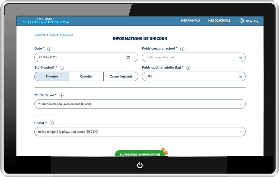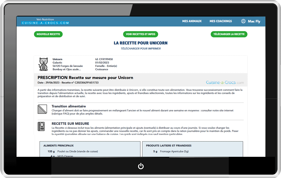 Une fois connecté à votre compte Cuisine-a-crocs.com. l'onglet "mon compte" comprendra toutes les informations, sa courbe de poids avec points de repère, ses recettes. Vous pouvez à tout moment commander de nouvelles recettes en variant les ingrédients, ainsi que les télécharger ou les imprimer.